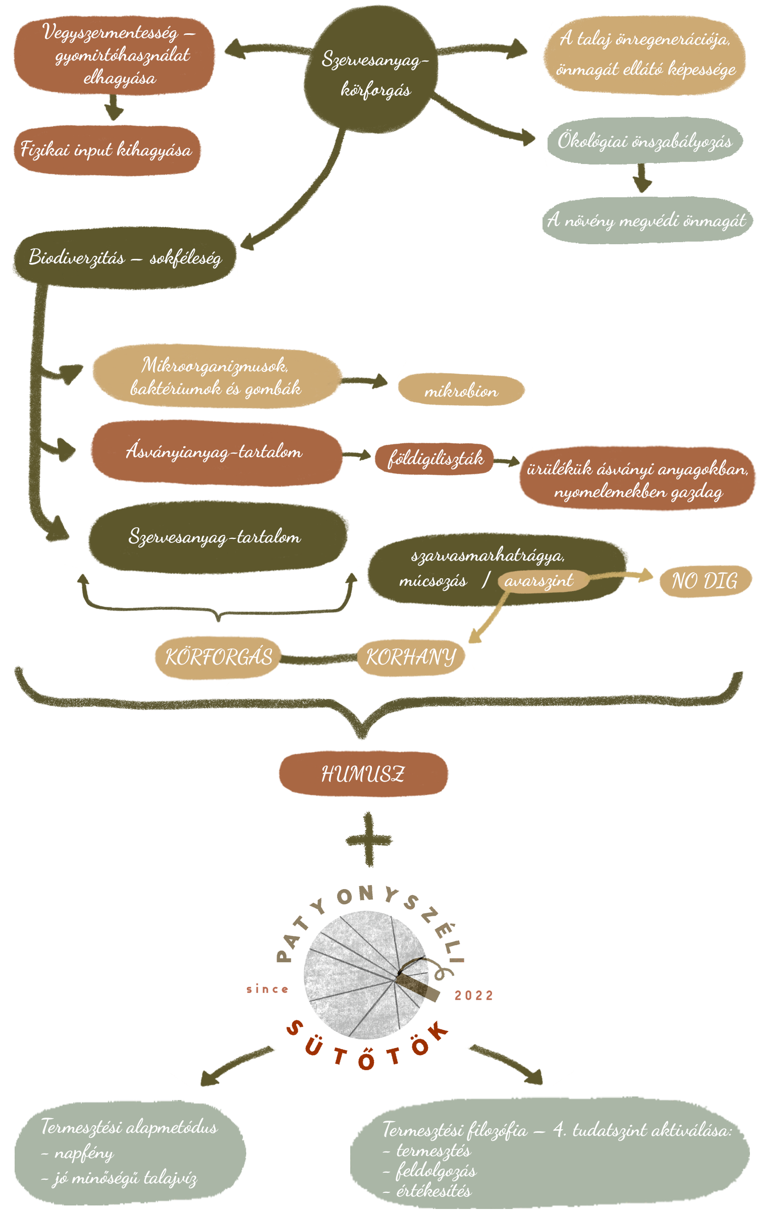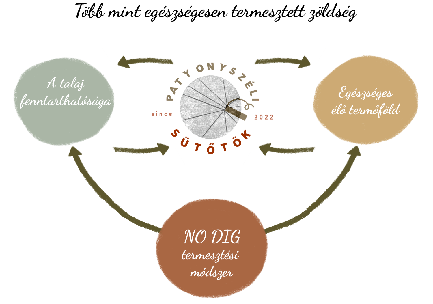 A termesztési folyamat a mai trendnek megfelelően nevezhetjük bio termesztési folyamatnak, hiszen nem használunk vegyi növényvédő szereket, de valójában az időutazás tengelyén semmi újat nem fedeztünk fel, csak egyszerűen visszanyúltunk gyökereinkhez. Az emberiség történetéhez, mikor az emberek kb. 10 - 11 000 évvel ezelőtt úgy döntöttek, hogy önmaguk helyben termelik meg a terményeket. Nem volt semmi, csak a föld, a napfény, a csapadék, később az öntözés és a szerves állati trágya és a sok-sok emberi jelenlét gyönyör és figyelem, odafigyelés a növény iránt. A Patonyszéli sütőtök mint márka ezt az életfilozófiát képviseli. Együnk brutálisan finomat, ami beltartalmilag egészséges és helyi, lokális jellegű.Talajművelés, termesztési módszer - no dig (nincs ásás, szántás)Termesztési folyamat - egyszerű és ősi – tiszteletben tartja a földet