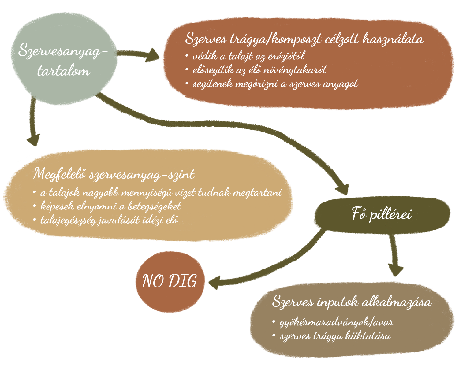 A NO DIG típusú gazdálkodáskor mindhárom készletet növelnünk kell. Ez a kulcsa annak, hogy egyszerre gyarapítsuk a talajunk szervesanyag-tartalmát, és közben élvezzük a szerves anyag lebomlásából származó előnyöket, beleértve a tápanyagok felszabadulását, az aggregátumképződést, a víz megtartását.