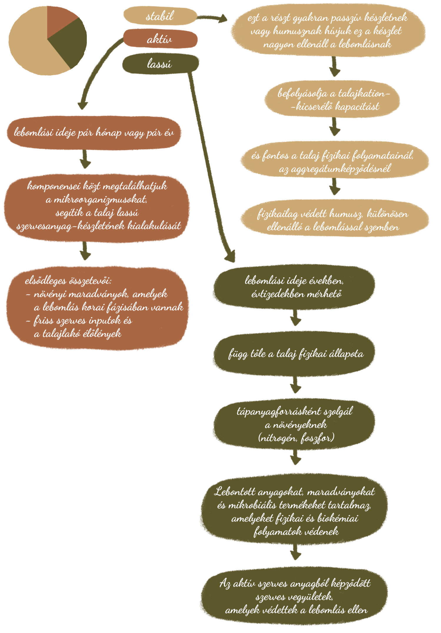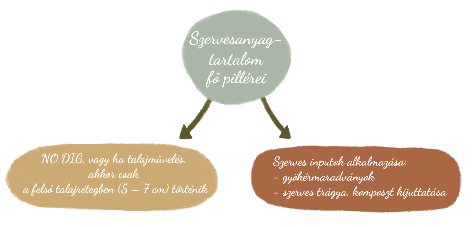 I. A szerves anyag a fenntartható növénytermesztési rendszerek alapja.II. Ha szeretnénk növelni a talajunk minőségét és javítani működését, akkor azt a szerves anyaggal kell kezdenünk, mert ennek van a legnagyobb hatása a talaj fizikai, biológiai és kémiai tulajdonságaira.III. A szerves anyag a talajlakó élőlényeknek élőhelyet és táplálékot biztosít, ebből kifolyólag a talajlakó közösségek diverzitása, biomasszája és aktivitása szorosan összefügg a szerves anyag koncentrációjával.IV. A talajok termékenységéhez elengedhetetlen a megfelelő mennyiségű szerves anyag.V. Talajainkat változatos szármaradvány - tömeggel fedjük be, amely tartalmaz stabil magas szén:nitrogén arányú anyagokat, mint a búzaszalma és könnyebben lebomló anyagokat (pillangós növények maradványai) tartalmaz.VI. A növények (sütőtök) gyökérzete és a komposzt lassan lebomló anyagokat adnak a rendszerhez, amelyek segítenek a szerves anyag gyarapításában. Ezeket kiegészítik a könnyen lebontó vegetatív, tápanyagban gazdag növényrészek, amelyek tápanyagforrásként szolgálnak.
