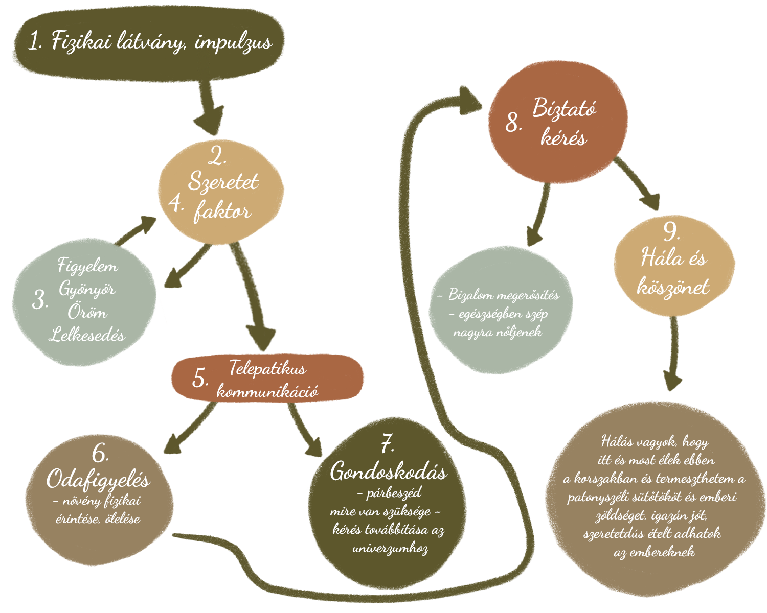 Épp ez a folyamat észlelhető a gyermeknél is, mikor életében legeslegelőször ültet magot a földbe. Érezzük a vágyakozást, az örömöt, mikor a földből kibújt a palánta. A gondolatainkban a lelkesedés, a pillanat óriási végtelen tere jelenik meg, telepatikusan kommunikálunk. Ezt a belső mentális energetikai tevékenységet, alaphabitust, mint belső mentális kedélyt, mentális energetikai faktornak neveztem el, ami valójában egy összvízió esszencia – vagyis még nincs fizikai látható jele, hogy milyen lesz a növény, a termés. Csak bízom benne, hiszem és tudom minden kételkedés nélkül, hogy mit /kérést/ telepatikusan közvetítek felé, azt megteszi a növény a kedvemért, hogy szép, egészséges, nagy lesz. Simogatom leveleit, indáit és közben nagy hálával és gyönyörtől – az egészséges látványtól és a jelen pillanat átéléséből telepatikus kommunikációba kezdek a növénnyel, és érzem, tudom, hogy növekedésre sarkallom, hogy egészséges termést produkáljon.
